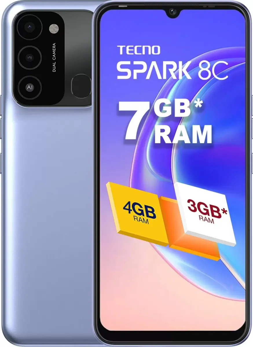 The Tecno Spark 8C is a Smartphone. Brand: Tecno. RAM: 4 GB. Storage: 64 GB. Battery: 5000 mAh, Li-Po Battery. OS: Android v11.