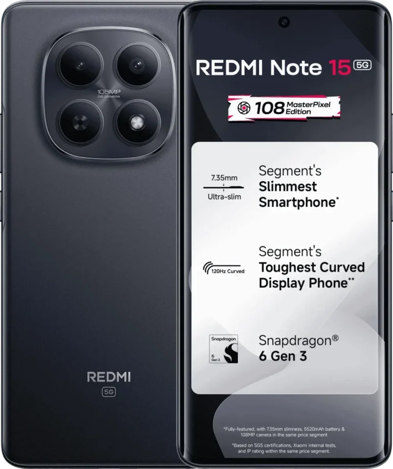 The Xiaomi Redmi Note 15 5G is a Smartphone. Brand: Xiaomi. RAM: 8 GB. Storage: 128 GB. Battery: 5520 mAh. OS: Android v15.