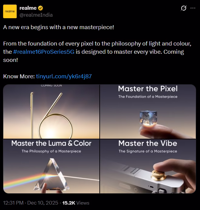 Realme posted a message on its official India newsroom. It declared the arrival of the Realme 16 Pro Series as a new masterpiece in its number lineup. The post focuses on refined design and strong craftsmanship for the upcoming devices.